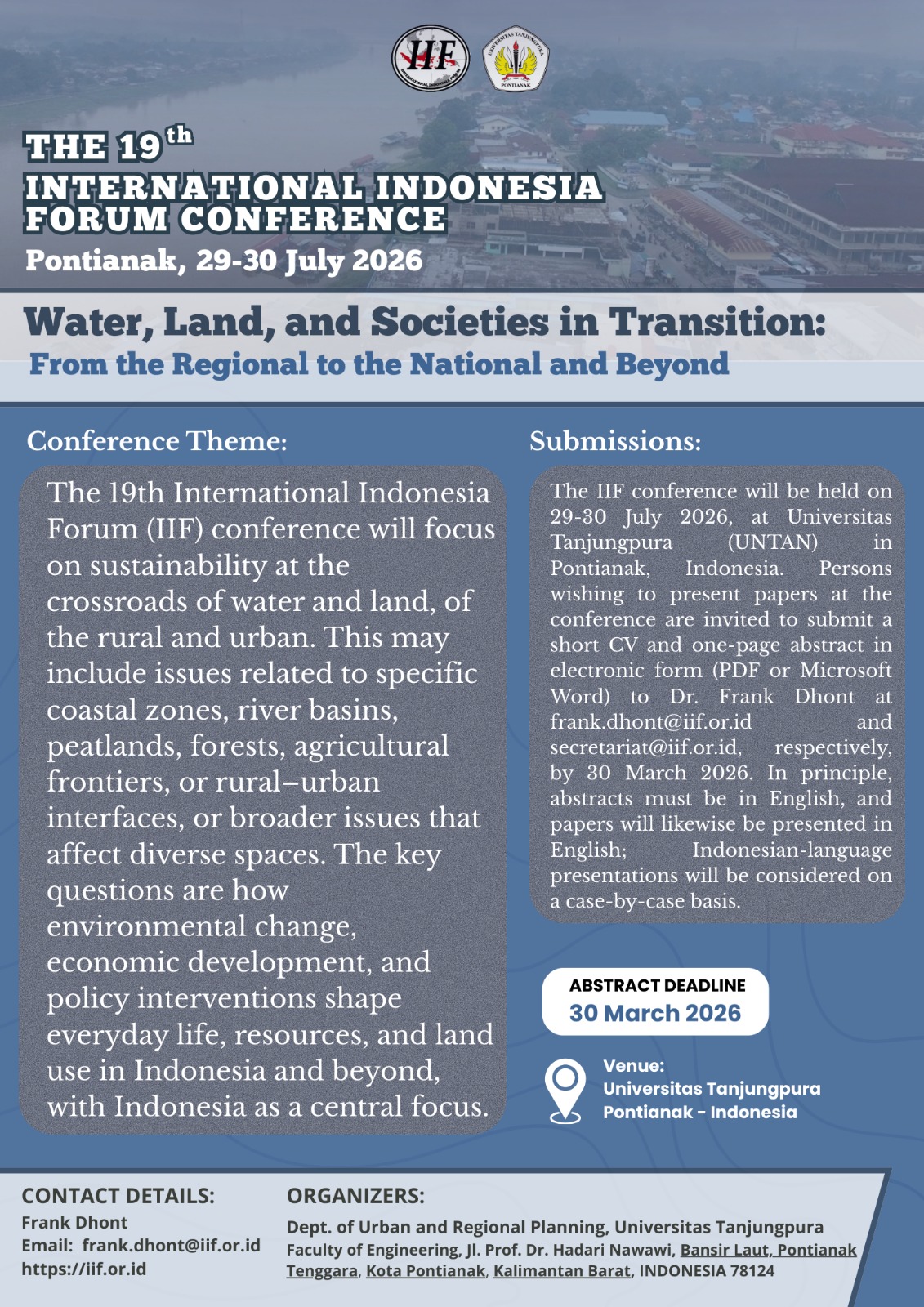 The IIF conference will be held on 29-30 July 2026, at Universitas Tanjungpura (UNTAN) in Pontianak, Indonesia. Persons wishing to present papers at the conference are invited to submit a short CV and one-page abstract in electronic form (PDF or Microsoft Word) to Dr. Frank Dhont at frank.dhont@iif.or.id and secretariat@iif.or.id, respectively, by 30 March 2026. In principle, abstracts must be in English, and papers will likewise be presented in English; Indonesian-language presentations will be considered on a case-by-case basis.